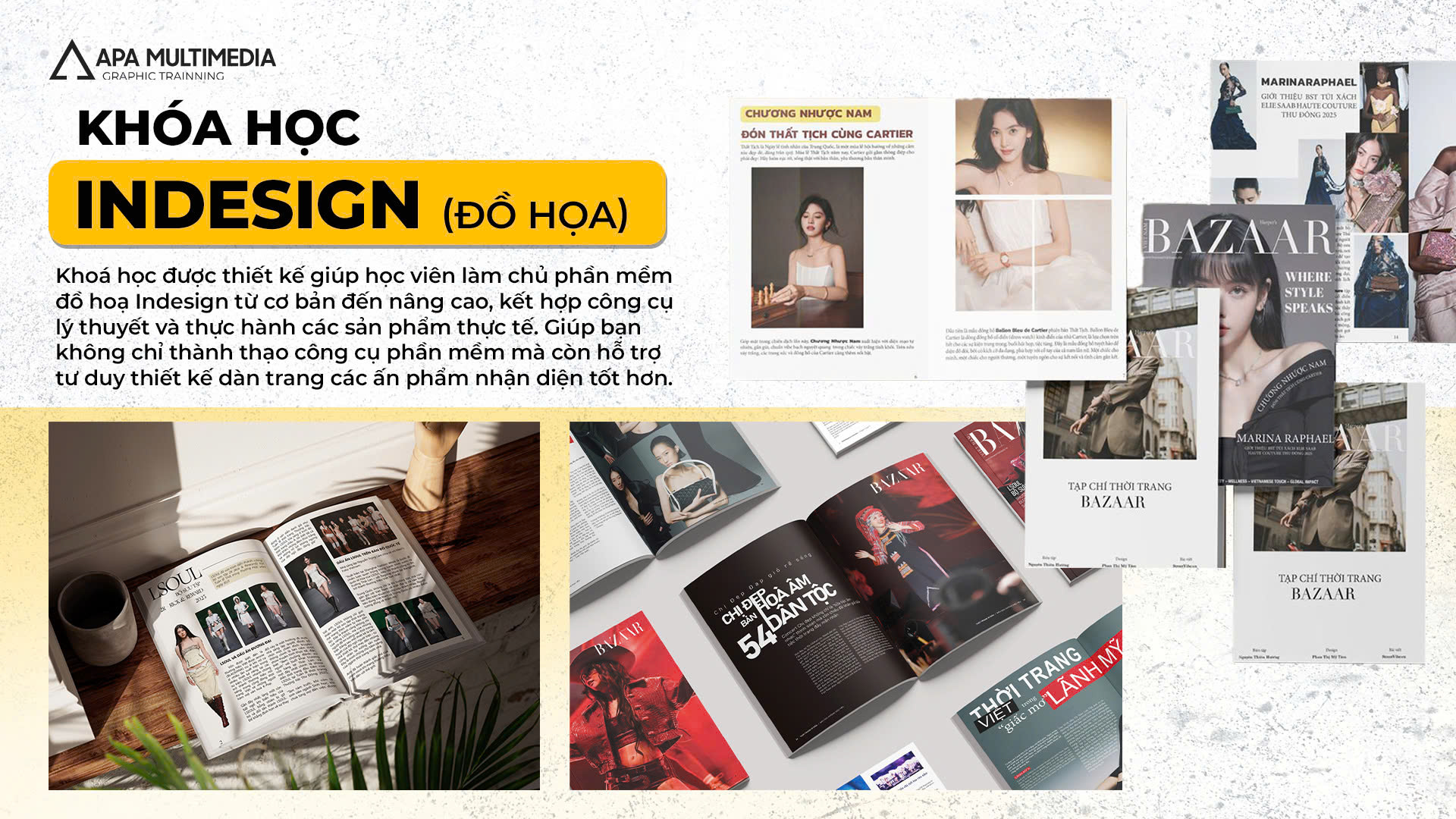 Khoá học được thiết kế giúp học viên làm chủ phần mềm đồ hoạ Indesign từ cơ bản đến nâng cao, kết hợp công cụ lý thuyết và thực hành các sản phẩm thực tế.